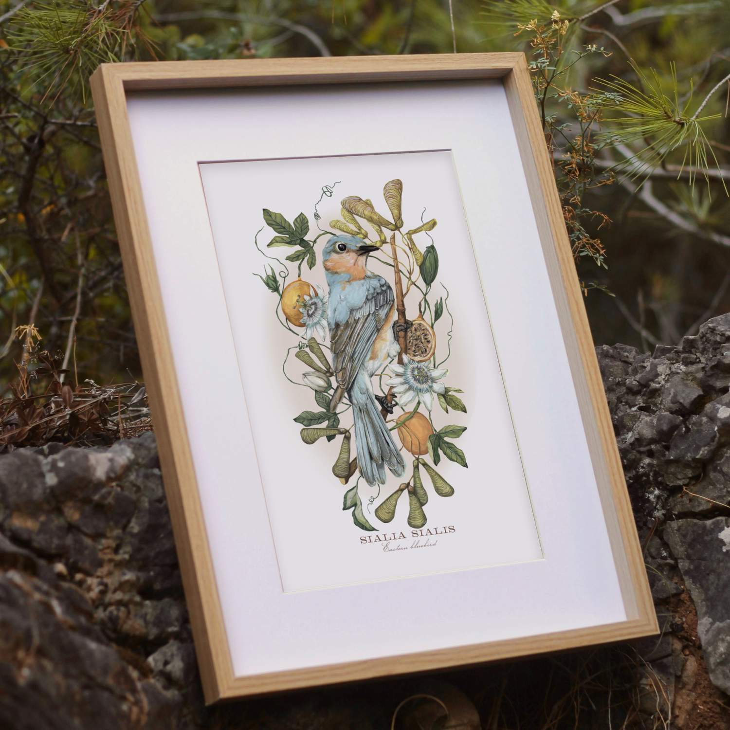 The Air Bird, an eastern bluebird surrounded by passionflower vines and maple seed pods — representing the dynamic flow of the air element.