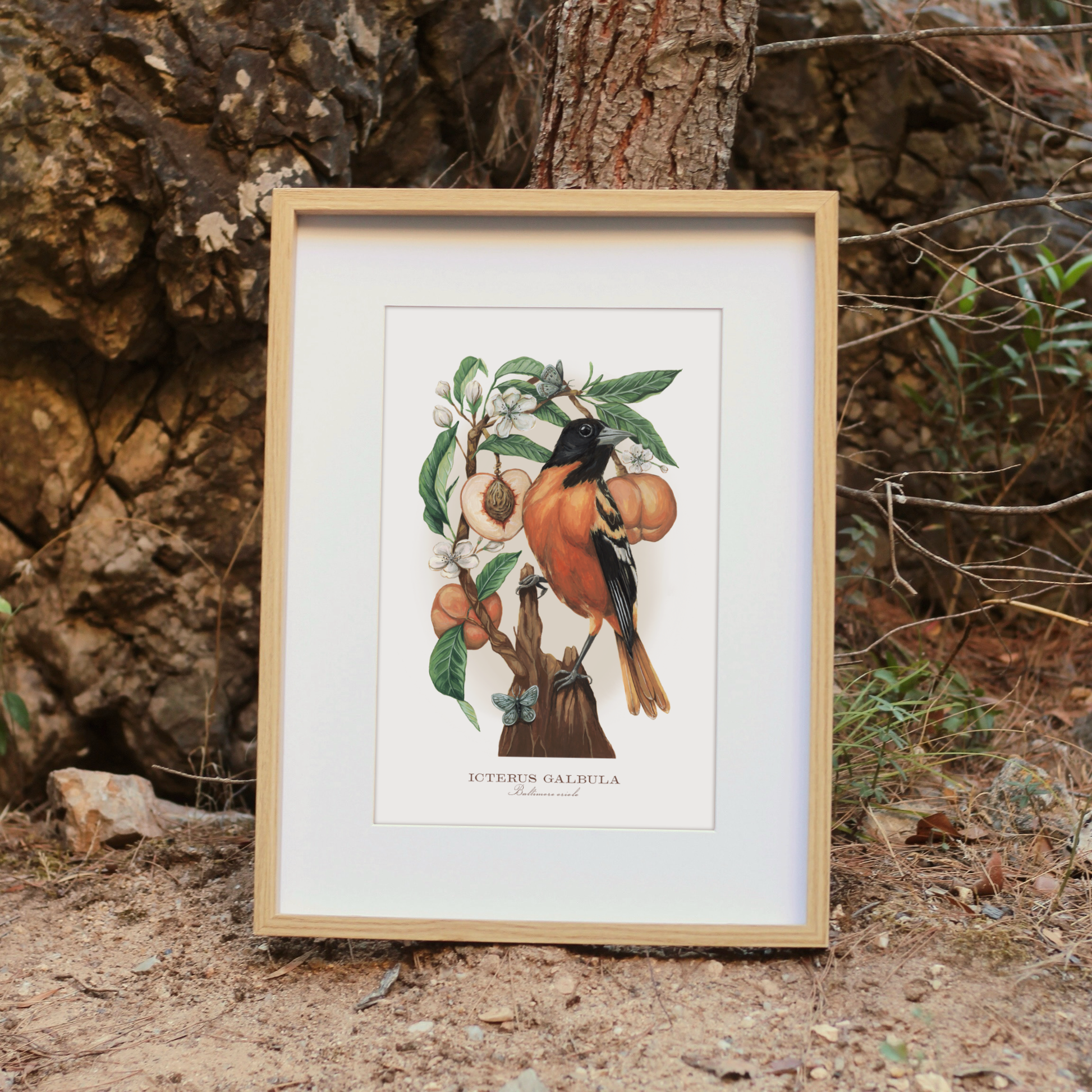 The baltimore oriole, a New World blackbird, loves open woodlands. In the fall, they feed on nectar and fruit, such as peaches. The peach originated in China, and its seeds travelled along the Silk Road to the rest of the world. This oriole is perched on a peach tree that was burned by fire. It represents new beginnings and growth after destruction.